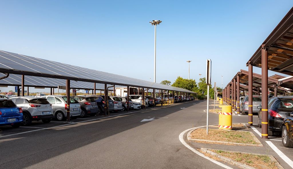 Il parcheggio Lunga Sosta COPERTO fa della ecosostenibilità il proprio tratto distintivo: sono infatti ben 1.600 posti auto green forniti di pannelli fotovoltaici con collegamento gratuito ai terminal dell’aeroporto mediante servizio navetta ecologica alimentata con motore a metano di ultima generazione.
